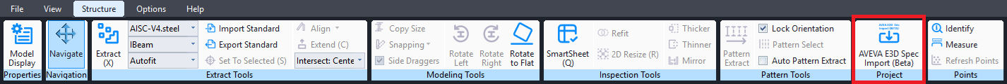 - With a structure model selected in EdgeWise, first select the Structure tab in EdgeWise, then click the AVEVA E3D Spec Import button. This will open a file explorer where you can locate the CSV files you exported from AVEVA E3D.
