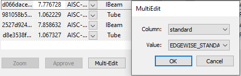 The generated standard will include only the shapes and sizes included in the spec files you selected for import. If, for example, you do not import any Angle Iron specs (E3D ANGL gtype), you will not be able to extract angle iron shapes with this standard or apply the standard to existing angle iron elements. Please note that this tool will not make additional shapes available in EdgeWise- it applies only to the native EdgeWise steel shapes (I-beams, angle iron, channel, tees, tube, and round tubing).
