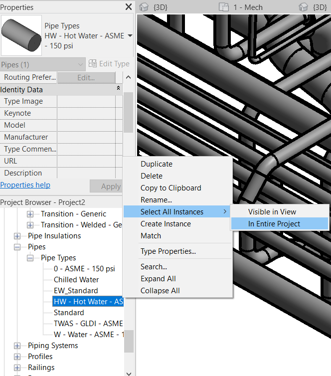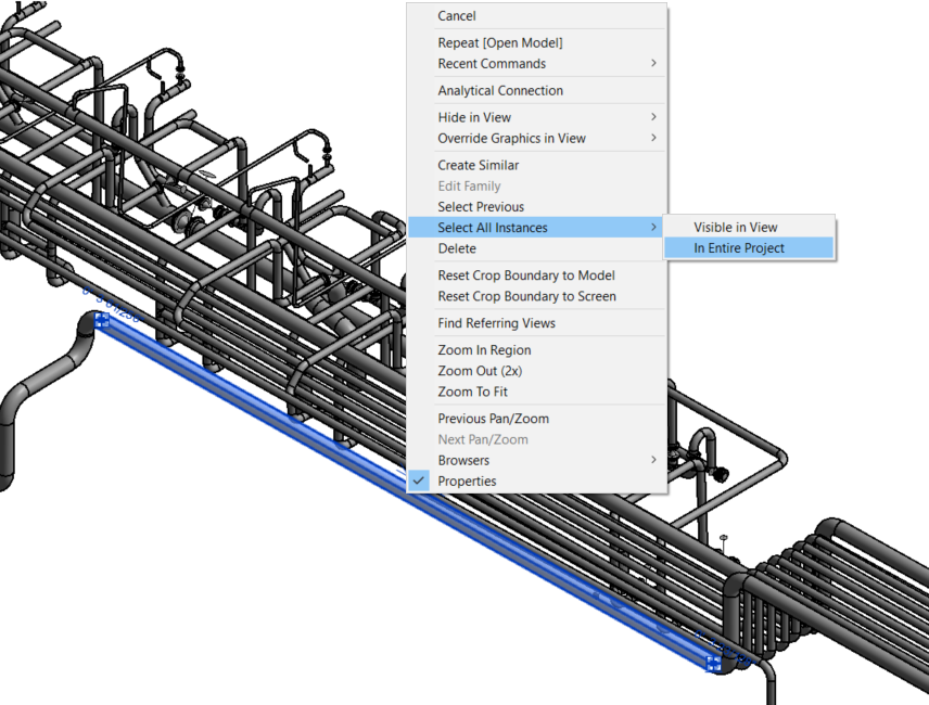 Alternatively you can perform this selection in the Project Browser in Revit. In the Project Browser, scroll down until you see Families. Expand this menu and look for Pipe Accessories, Pipe Fittings, and Pipes. These three family categories contain the EdgeWise family types. You can select families here by right-clicking the family name, clicking Select All Instances > In Entire Project.