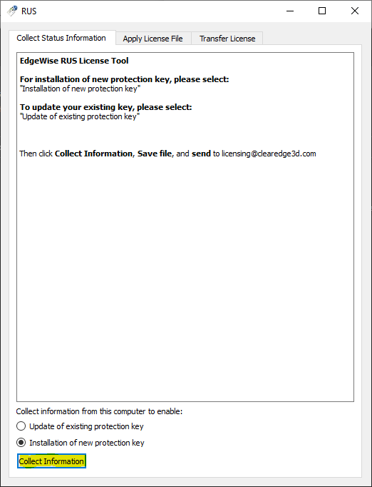 - Select the Installation of new protection key bubble at the bottom of the RUS Tool, then click the Collect Information button to generate and save the .C2V file.