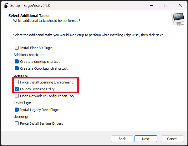 When installing EdgeWise, we recommend adjusting the Licensing Additional Tasks by marking the Force Install License Environment checkbox, and unmarking Launch Licensing Utility checkbox, as shown below. For this type of license activation, we recommend using a file exchange for activation as opposed to an activation code, so the Licensing Utility window is not necessary.