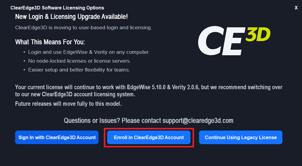 If you have an older license from versions 5.9 and prior, you can continue to use this license for version 5.10. To do so, you can click the Continue Using Legacy License button. You will not need to create a ClearEdge3D Account to do this but we do recommend eventually creating a ClearEdge3D Account to use future versions of EdgeWise as legacy licenses will not work for planned versions 5.11 and newer.