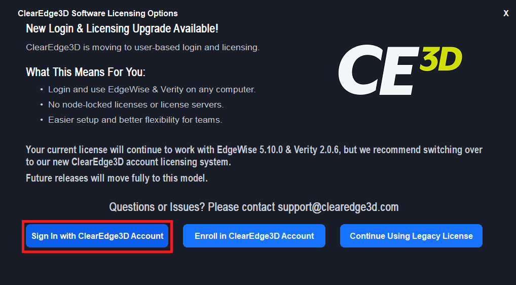 EdgeWise licenses will use your ClearEdge3D Account to log in and out of an active license.